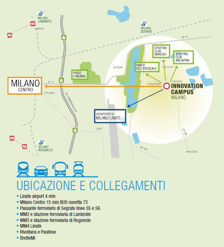 Il campus offre accessi rapidi a Milano e alle principali infrastrutture: 4 minuti da Linate, collegamento diretto con la M4 tramite la linea 73 a 250 metri, e vicinanza a Tangenziali e TEEM. È inoltre attivo un servizio navetta dedicato da Milano Lambrate e Rogoredo.